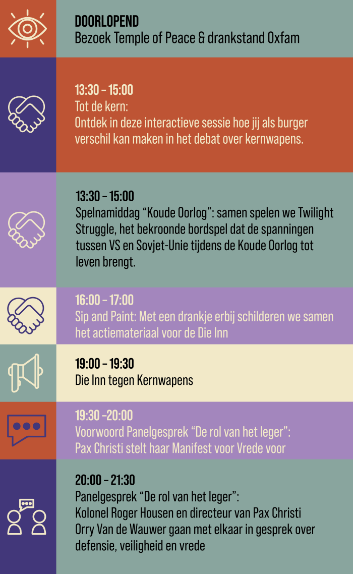 Hoe kunnen veiligheid en vrede samengaan? De Dag van de Defensie brengt experts samen rond kernwapens, defensie en internationale samenwerking, met lezingen, workshops en acties voor een wereld zonder wapenwedloop.