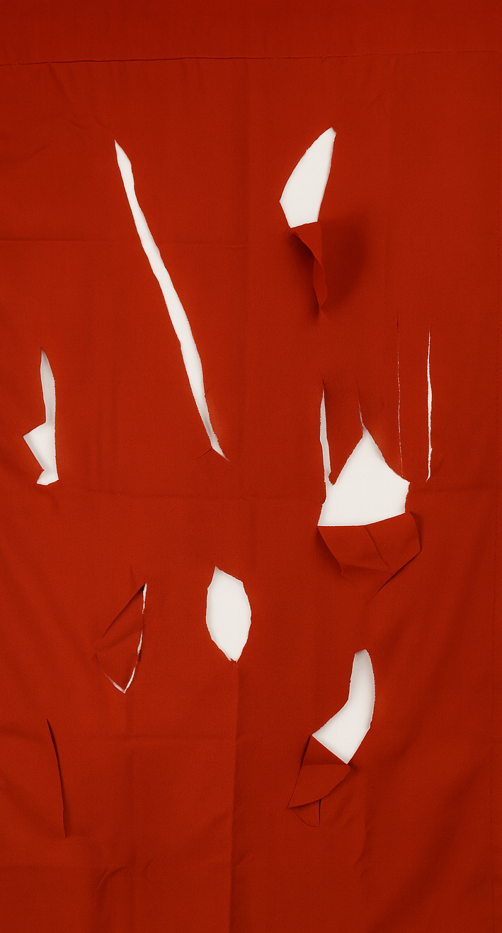 De rode vlag toont het omgekeerde van weerbare vrede: verwoestend conflict. De kleur van strijd overheerst, maar door de scheuren heen verschijnt wit: de kleur van vrede.