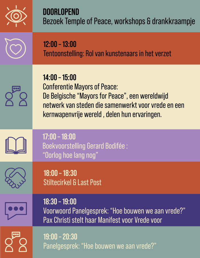 Tijdens de conferentie Mayors for Peace lanceren burgemeesters uit heel Vlaanderen een gezamenlijke verklaring over de rol van lokale besturen als vredesbouwers. We sluiten deze Dag van de Vrede af met een boeiend expertenpanel dat samen verkent hoe we kunnen bouwen aan vrede.