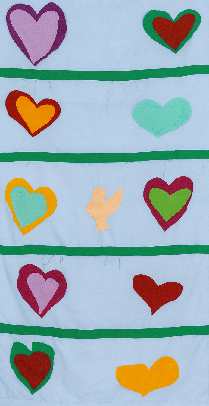 Een ontwerp door Pax Christi Vlaanderen. De vlag werd genaaid door Peace Seekers Nederland.
