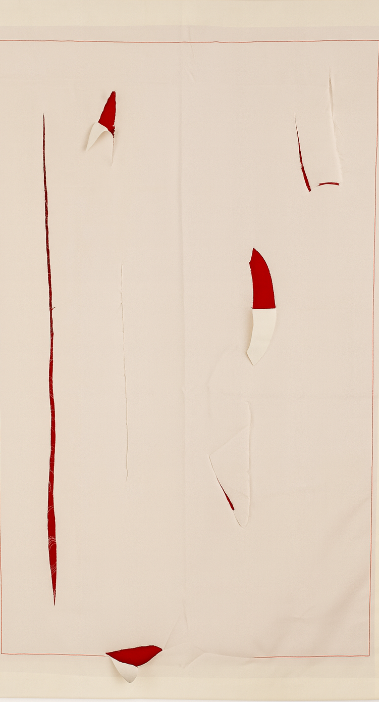 De witte vlag met rode scheuren verbeeldt weerbare vrede. Ze lijkt op het eerste gezicht fragiel: een witte vlag die beschadigd is, opengebarsten, met de rode kleur van conflict eronder.