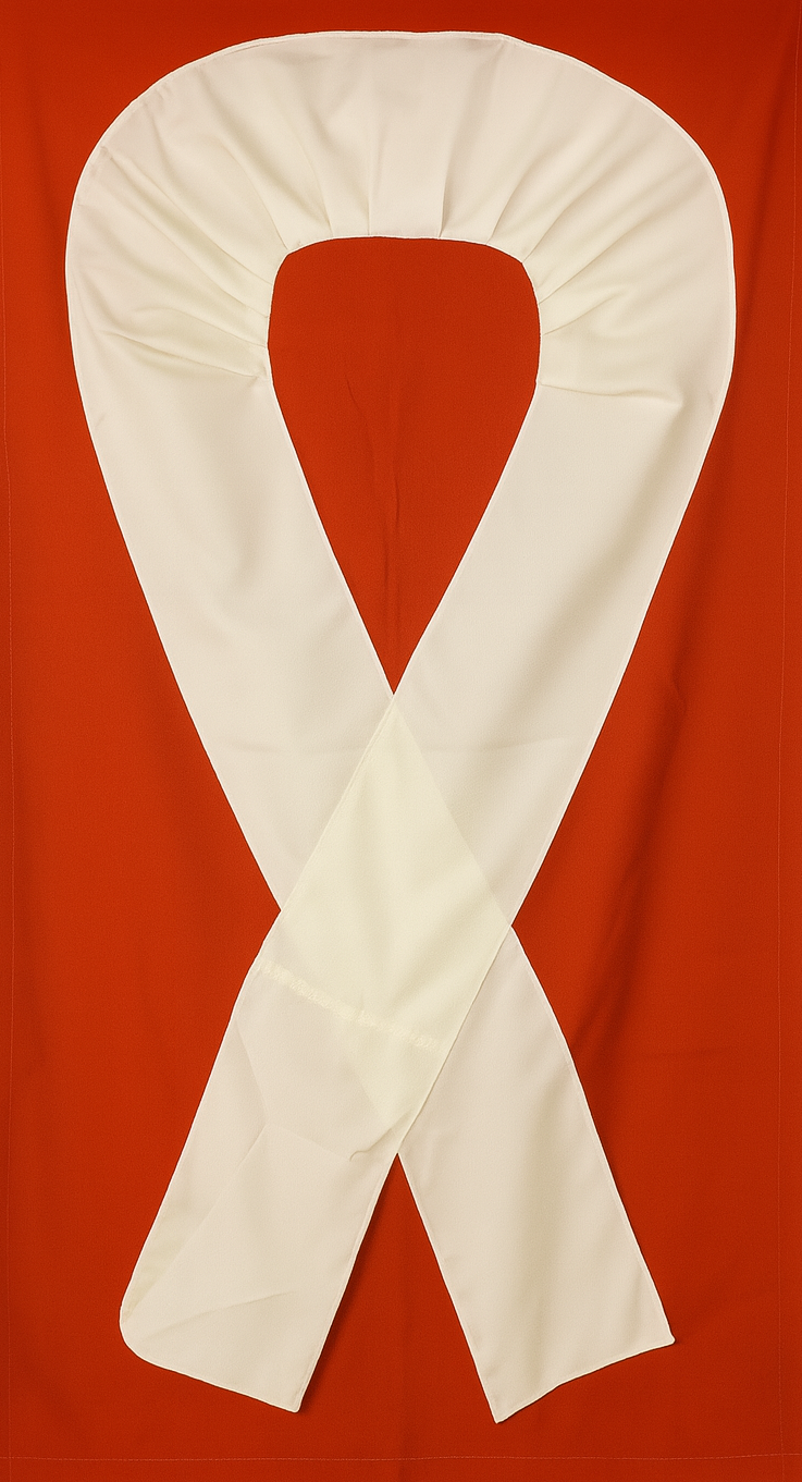 Een eenvoudig wit lint, symbool van vrede en geweldloosheid. De kleur wit staat voor stilte, verzoening en de moed om het geweld te doorbreken.