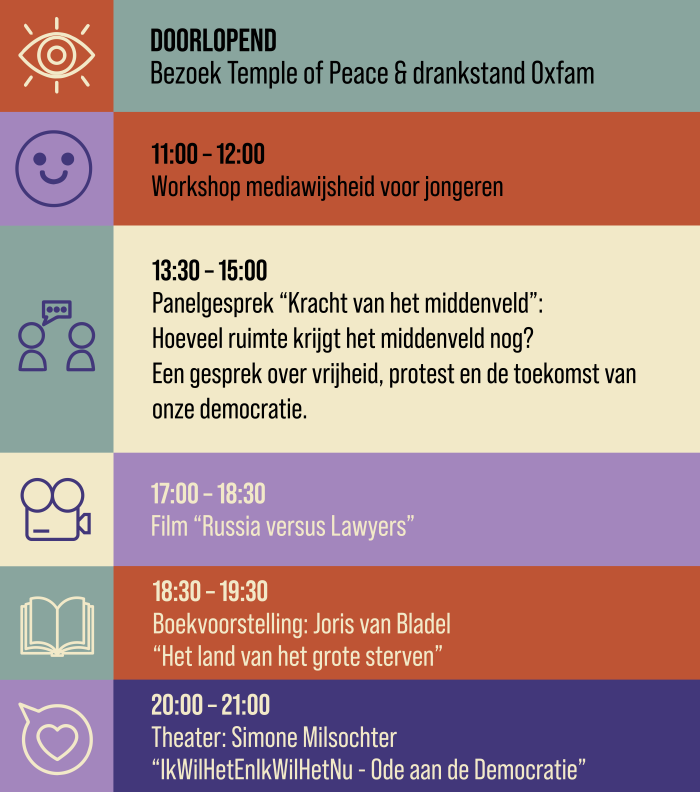 De Dag van de Democratie is een dag vol gesprekken over burgerzin, mediawijsheid en de rol van het middenveld. Met theater, film en boeken die de waarde van democratie en vrijheid belichten.