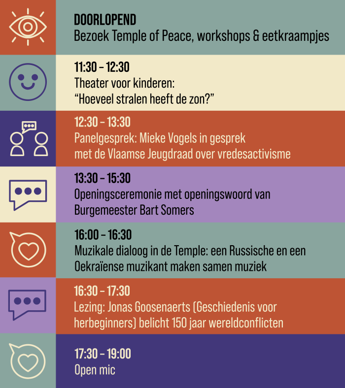 Een feestelijke start van het festival, met een grote openingsceremonie, getuigenissen uit de Peace Labs, muziek en theater.